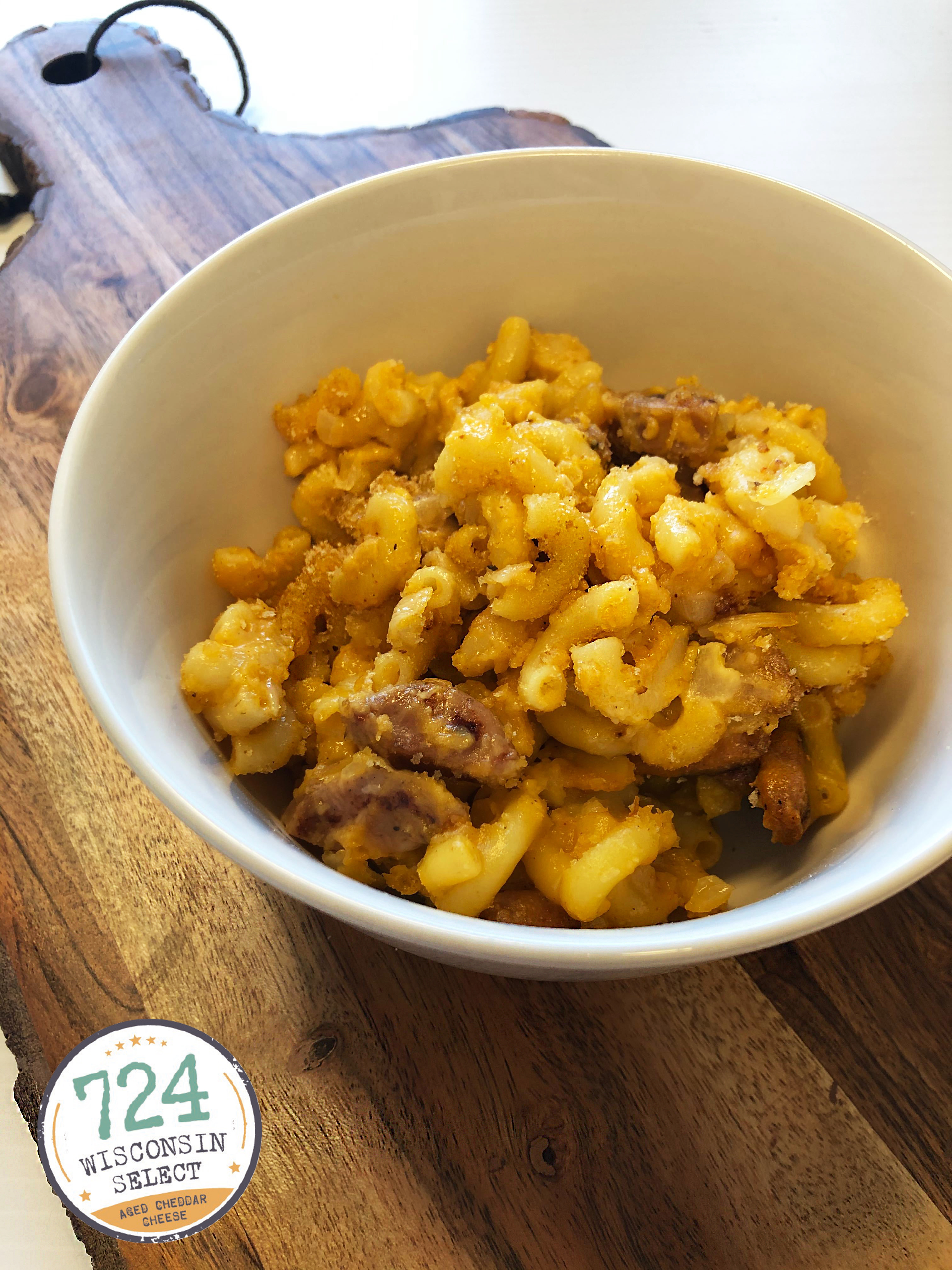 - Pour the macaroni into the cheese sauce, and stir to combine. Add in the Sausage, cayenne pepper, salt, and black pepper.
