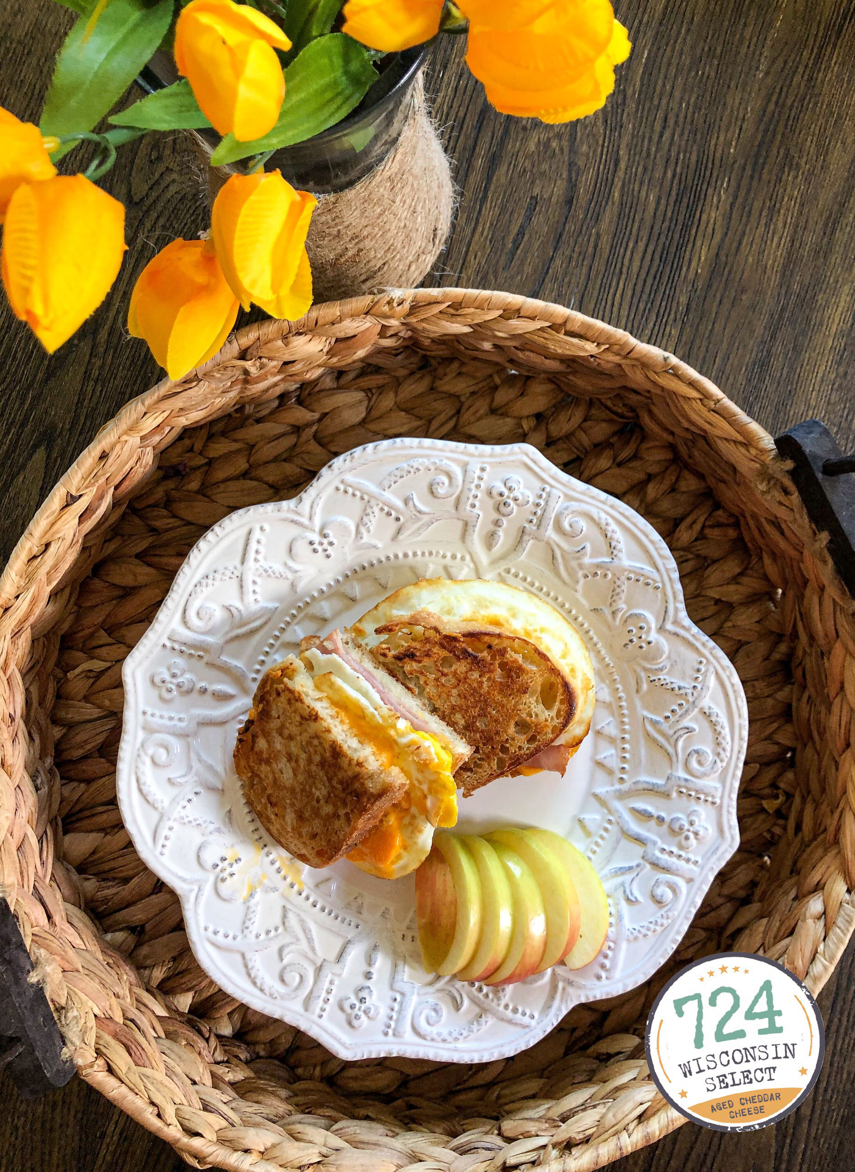 Once both pieces of bread are browned to your liking. serve with apple slices, your favorite berries, a Mimosa or Bloody Mary. To add a little spice to your sandwich, grab a spicy aoli or mayo.